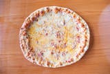 Old world pie, sauce, fresh mozzarella, fresh basil.